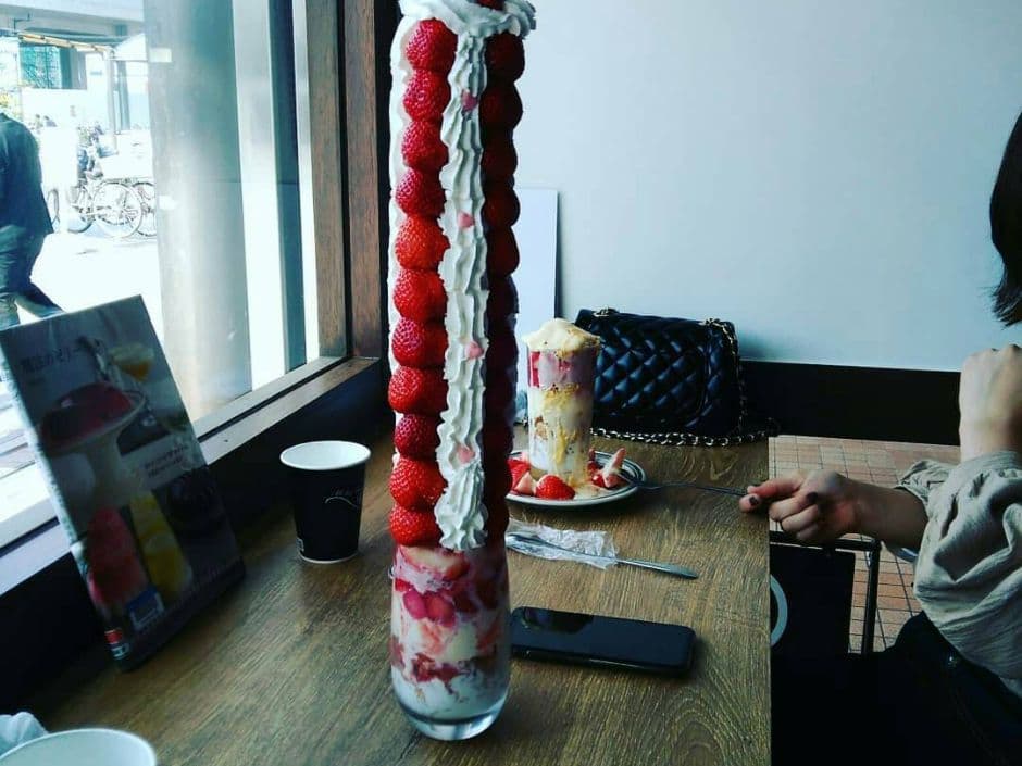 私は「イチゴのフォンダンショコラパフェ」を注文。濃厚なチョコとバニラアイスにイチゴのさわやかさが絶妙に合っていて、幸せな時間を過ごさせて頂きました。ちょうどその時、お隣のカップルが名物「イチゴの山登りパフェ~マウントエベレスト~」を注文されていたのですが、これがパフェか!!というぐらいの迫力。お店の外を通られている方も写メを撮っていくほどの存在感でした。